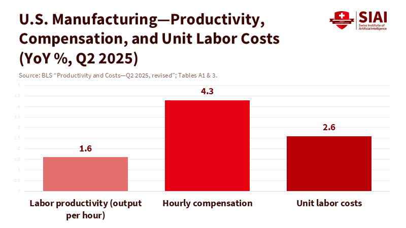 The political push to tax imports views reshoring as a trade policy issue. However, the deciding factor for a factory's location is actually a unit cost issue. BLS defines unit labor costs as hourly compensation divided by labor productivity; changing the productivity figure significantly alters reshoring calculations, even if nominal wages remain high. In simpler terms, unit labor costs represent the amount of labor required to produce one unit of output. Throughout 2024, manufacturing unit labor costs increased by 3.3 percent because compensation grew faster than modest productivity gains. By the second quarter of 2025, productivity gains improved to 1.6 percent, but still not enough to quickly influence location decisions. This is why merely increasing import barriers could lead to higher capital expenditure prices and slower equipment upgrades. Tariffs have already raised costs for crucial machine tools and components, causing U.S. manufacturers to pay more for Chinese machinery that they still rely on directly or indirectly through imports from third countries. Penalizing components without reducing labor intensity through automation will keep costs high and restrict capacity.