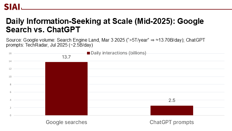 Figure 1: Search still dwarfs chat by ~5–6× in daily volume, so even tiny RL-style feedback biases in search ranking can shape what learners see at population scale.
