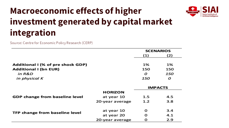 This is precisely the new perspective recent macro modeling proposes. A new VoxEU analysis calibrates a euro-area dynamic equilibrium model with two types of capital—physical and R&D. Greater integration decreases the cost of capital by about 50 basis points (the price channel) and, even with cautious assumptions, raises output by around 1.5% over ten years if the extra investment goes to tangible capital alone. However, when the same marginal euro is directed to R&D, the model's quality channel—representing skilled, risk-tolerant capital—boosts total factor productivity by 3–4% and raises GDP by 4% in ten years and 6% in twenty. It also adds an extra 1.6% of GDP from a realistic reduction of the EU–US VC gap. In simpler terms, quality allocation is more important than cheap allocation. That concept reflects Sutton's principles in macro terms.