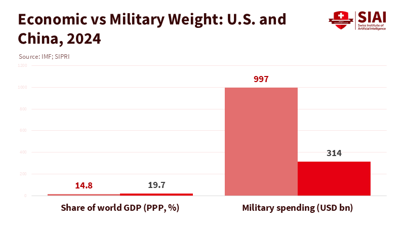 Figure 1: China leads in economic weight, but the U.S. still dominates military spending, showing why the transition is gradual.The Three Axes of Transition