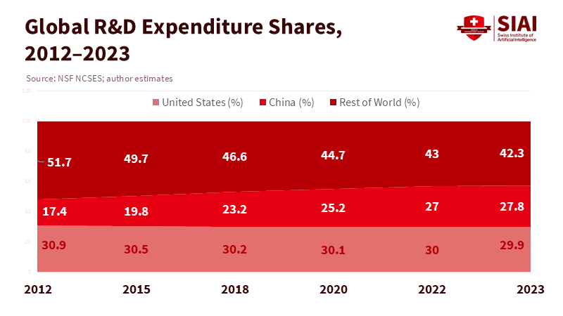 Let's start with capabilities. In output, China has moved ahead in PPP share, while the U.S. still leads in defense and many cutting-edge technologies. Global military spending reached a record $2.72 trillion in 2024; the U.S. accounted for 37%, with spending 3.2 times that of China. However, the gap in research is narrowing. The NSF's 2025 indicators estimate that in 2022, the U.S. contributed about 30% of global R&D and China about 27%. Newer NSF reports show U.S. R&D rising to roughly $940 billion in 2023, while China's growth rate continues to surpass that. In the AI sector, the 2025 Stanford AI Index reveals U.S. private AI investment exceeding $100 billion and ongoing U.S. leadership in top models, even as Chinese systems close performance gaps. Taken together, these measures indicate a gradual rebalancing: partial economic parity, enduring defense asymmetry, and a research competition with diminishing gaps—precisely the characteristics of a long slope, not a sudden turn. Note: PPP indicates economic weight, SIPRI reports are in constant dollars, and NSF applies PPP adjustments for international R&D comparisons.