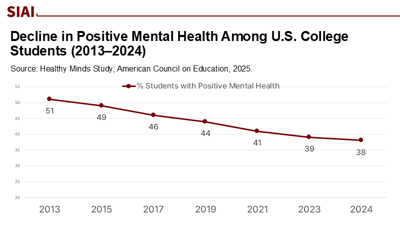 Figure 1: Student mental health has eroded steadily over the past decade, with fewer than 4 in 10 reporting positive well-being in 2024—just as digital mental-health tools proliferated.