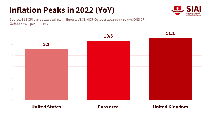 Figure 2: 2022 inflation peaks were historically high across major economies, underscoring why ‘routine’ look-through failed as a guide.Misjudging shocks can have a significant impact on public sector finances. The ECB’s significant losses in 2023-2024, partly due to interest expenses on bank reserves following rapid rate hikes, demonstrate that when rates must rise late and significantly, the financial repercussions can be severe. Losses do not stop a central bank from fulfilling its mandate, but they influence the political aspects of policy choices and impact public finances that support schools and colleges. In this context, the welfare loss from misperception is not just an abstract concept; it directly affects the budgets that fund classrooms, labs, and buses.